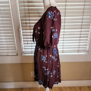 Fun and Flirty, Maroon Floral Print, Elbow Sleeve, V-neck with Tie Front, 100% Rayon, Mini Dress, In Excellent Condition and the Perfect Add for your closet 😀