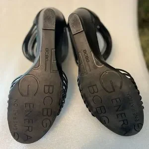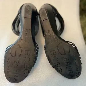 BCBG strappy heels with statement rhinestones and jewels. Ver comfortable, can be dressed up or worn casually. (GUC)