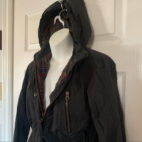 Black Orvis River Road I jacket, with waxable cotton exterior and leather collar. Cinchable waist. Nice quality, no flaws. Extra small. Make offer!