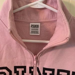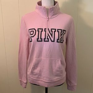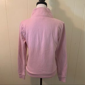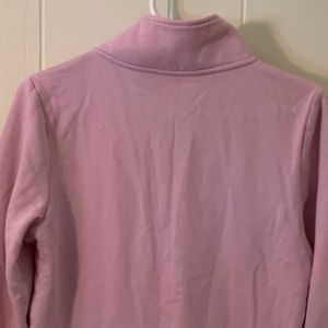 Cozy light pink pullover is comfy and soft. Cotton blend. Raised neck, hand pocket, zippered front. In very good pre-owned condition. No rips, tears, stains. From a smoke-free home.