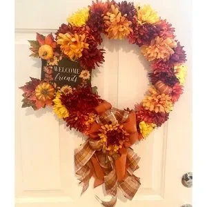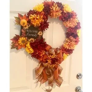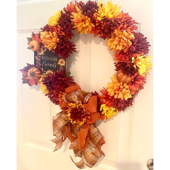 One-of-a-kind! Beautiful handmade burst of flowers fall wreath in orange, yellow, copper, & wine. Cute “Welcome Friends” sign attached with coordinating flowers, pumpkins, leaves, & wired ribbon. Awesome inside or out. I love hanging a wreath inside my front door too! It’s also slim enough to hang between a door & storm door. Approximately 19”