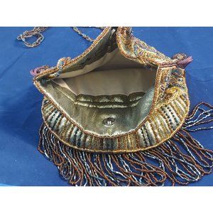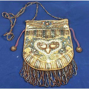 Get this gorgeous, Mini Bag, Fully beaded, with fringe and beaded strap. measures 7" wide by 8.75" tall (without the fringe). beautiful beaded design over gold taffeta, This bag will fabulous as an acsessory for your evening outfit.