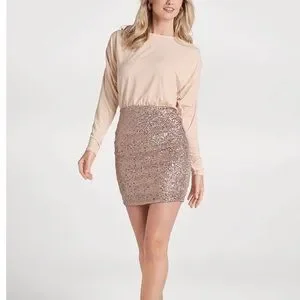 The easy blouson top of this dress is subtly understated, but the glittered-up bottom half draws all the attention! Sequins cover the fitted skirt of this mini while the plunging open back adds even more flair to the flirty fit. Finish it off with glam strappy heels and step out in show-stopping