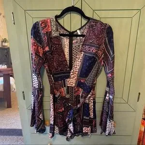 Cute bell sleeve patterned romper, deep neckline. Size S/M