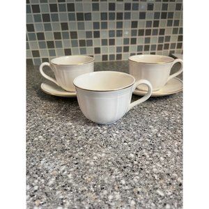 This listing is for a 5 piece lot of Royal Doulton china. There are 3 cups and 2 saucers. White with gold trim. They are in great preowned condition. Only flaw I really see is in the last picture---looks like an extra piece of china on the bottom rim----doesn't affect the cup.