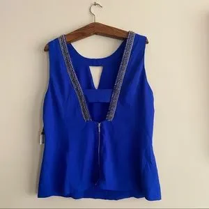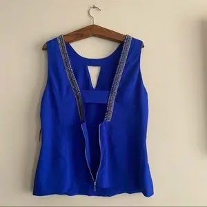 Gorgeous royal blue embellished tank top by XOXO. Top has a somewhat fitted look around the waist, has a keyhole in the front, and beautiful black and silver beading accents along the edges. The back is low cut with a silver zipper. This has never been worn except to try on. No rips or stains and comes from a pet-friendly, smoke-free home.