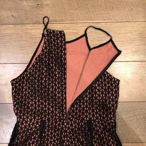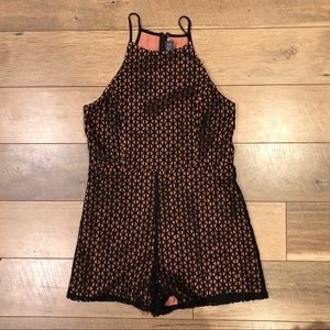 Astr Spaghetti Strap Lace Overlay Romper. Fully lined shorts romper with invisible back zipper. Pink lining, black lace.