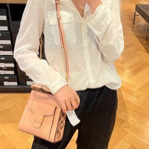 SO CHIC & BRAND NEW! Coach Mini Pepper soft shell petal pink pebbled leather with snake embossed detailing small cross body satchel. PERFECT purse with jeans, shorts, business, beach, skirts, slacks, dress, tank top, t-shirt, leggings, yoga pants, Althleisure, Leisurewear, Y2k look for Spring, Summer, Fall, Winter! This very on trend satchel has quality COACH gold tone hardware & chain. Creed c6779. ADORABLE! Coordinating sateen interior. Will hold your phone, small wallet, essentials, & kindle. Top magnetic snap closure on handbag. Dual fixed rolled animal print leather handles; adjustable, removable pink leather crossbody strap w/gold chain. Interior slip pockets inside this shoulder bag. Exterior slip pocket. GORGEOUS, eye-catching tote in PRISTINE condition: No wear, no stains, no tears, no smells, no damage. Smoke free. Comes in original packaging. $458, plus tax.