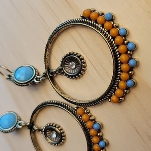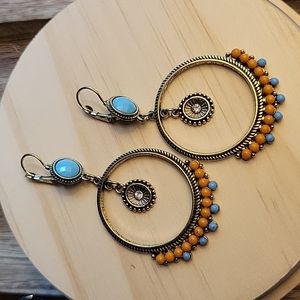 Antiqued style drop dangle hoops with vibrant beads in tangerine and turquoise with a dainty crystal accent.