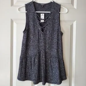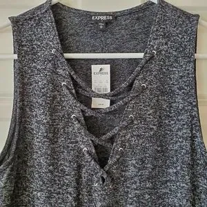 NWT Express charcoal gray sleeveless top, size medium. Cute top has a criss-cross along the front upper half, and a flowy bottom half with a light ruffle. Made from a soft rayon/polyester/spandex blend.