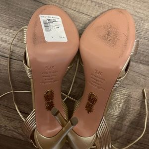 Shine from day to night in our Ari Sandal. Meticulously crafted in Italy from sleek specchio and laminated nappa in swank soft gold, the open toe silhouette features a cut out at the heel and slim laces that wrap elegantly around the ankle. The pair is balanced on a slim stiletto heel.