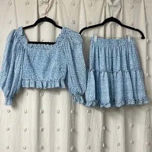 Adorable blue leopard print matching set from Red Dress Boutique! Only worn once. Top can be worn on or off the shoulders!
