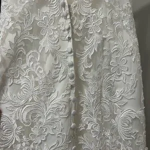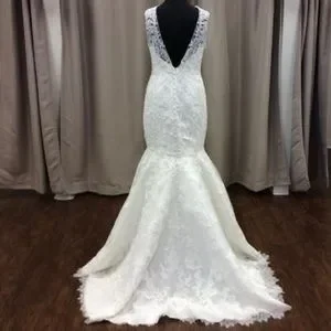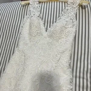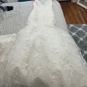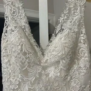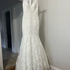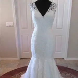 Brand new, never been worn before. Size 4 lace detail with rhinestone and satin button details down the back of the dress. Trumpet style with a medium length trail.