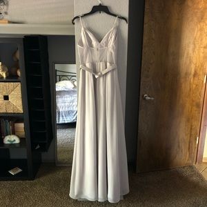 Beautiful Vera Wang White David’s Bridal Bridesmaid Dress in Silver, Size 4. This gorgeous dress has a sheer back bodice, satin waist band, and pleats on the front. Fits like a true 4. Worn once at my brothers wedding ceremony. Good as new!