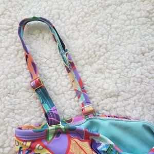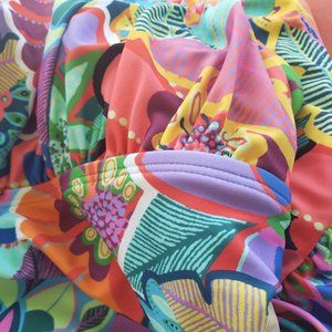 Key features: multicolor fun floral print, one shoulder with twist detail and optional/removable second shoulder strap, ruched belly