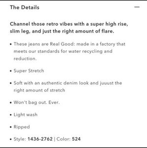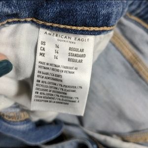 American Eagle AEO Super High Waist Distressed Flare Jeans in size 14 regular (31" inseam). Distressed at pockets, knee, and hems. Waist 16.75" rise 11". Good condition, some minor pilling on inner thighs as shown. I was sent wrong item by another seller so I don't need these. Super comfortable with good stretch and soft material. Ships immediately, smoke free home.