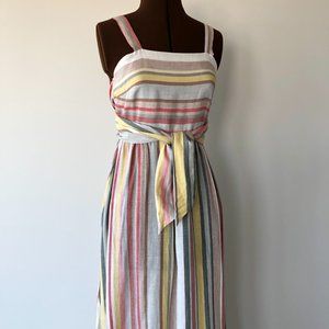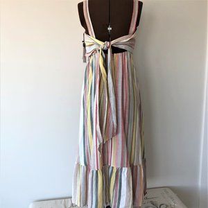 Multi-coloured striped linen blend sundress has square neckline, empire waist, bodice ties that can be tied in the back or wrap around the front, back zip and ruffle at hem. Wear it as is when the weather is still nice or throw a sweater over it and wear it in the fall.