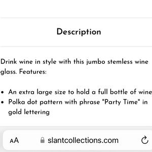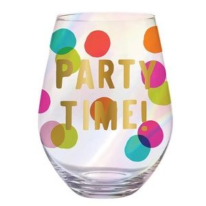 “Every day is a party” with this Slant Collections Jumbo Stemless Wine Glass. Polka dots with gold PARTY TIME make this glass perfect for gift giving or celebrating each and every day!