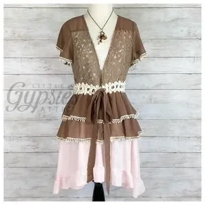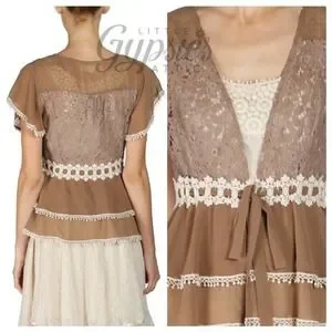 A lightweight, breezy Cardi Top with Crochet accents throughout and a waist tie.