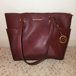 Merlot colored Charlotte Large Saffiano Leather Top-Zip Tote Bag from Michael Kors. Had less than a year and barely used. See pictures for inside of bag.