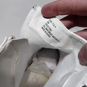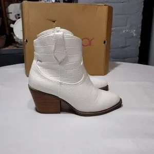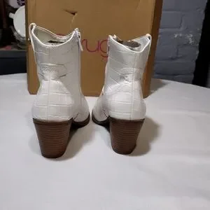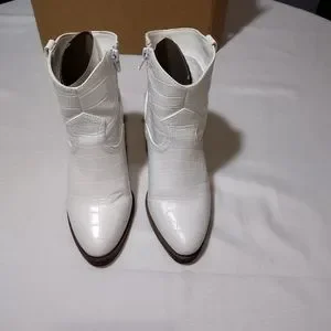 EUC White Vegan Leather Ankle Boots with zipper closure. These have a snake skin print. The seam detail at the vamp gives these sleek boots a western look. There is a pointed toe. The inside has a faux fur lining and a padded insole. They have a faux woodgrain block heel.