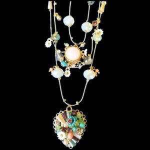 This is a Beautiful Tri-Necklace by Betsey Johnson. This Necklace has so many Beautiful Baubles and 2 Pendants. The top Necklace has a Beautiful Pendant with a Plethora of Baubles and an Opaque Stone in the middle of the Pendant. The Second Necklace (middle) has a Plethora of Beautiful Baubles. The Third Necklace (bottom) has the Gorgeous Heart Pendant and other Baubles going up the Chain. Gold-tone Hardware. Lobster clasp Closure.