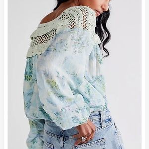 See photo for description. This is a gorgeous bodysuit, billowing with beautiful crochet detail. Tags marked to prevent store return.