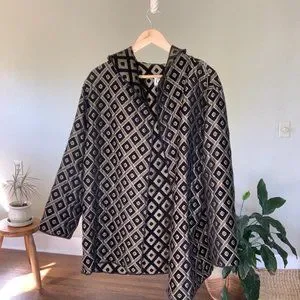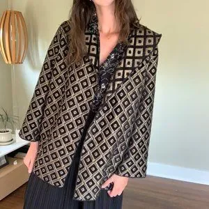 The perfect layering piece for fall and winter. The tan part of the fabric has the slightest bit of shine to it. No sizing or fabric info listed on the piece, but it fits like a large/extra large. Model is 5'10