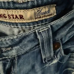 Big star designer jeans. Size 32. I had to shorten them to the length of 29.5 inches. they are ultra low cut bootcut jeans. Great condition. Light wash.