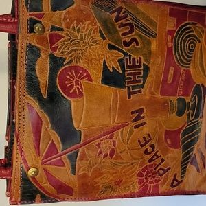 Pier1 leather bag~ 22" handles~ inside has 1 small side pocket~ outside of bag has additional large pocket for sunglasses and cell phone ~tropical design~beach and floral fruit designs~ coordinating lip case 💄 snap closure with mirror🌴🌸🏝♡♡♡♡NWOT