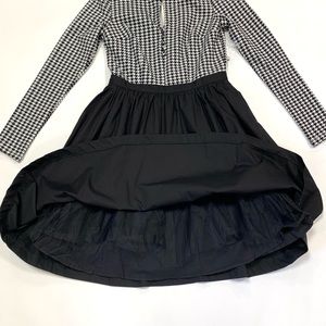 An adorable black and white houndstooth printed bodice crafted from ponte knit fabric complete with keyhole neckline and delicate buttons. Shares the stage with this frock's pocketed black skirt creating a twofer that is truly darling.