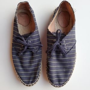 Navy blue striped canvas espadrille shoes with laces. Have raw cut hems. In great preloved condition.