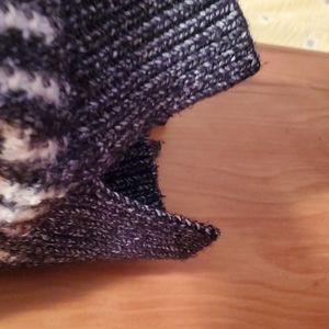 VS hooded sweater is size s/p and runs a little big. It has pockets in front and slits on both sides. It is a charcoal gray and creme.