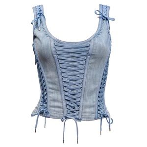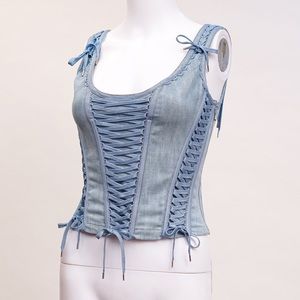 Christian Dior Denim Laced Corset Top size FR38. Designed by John Galliano in the early 2000s, as seen on Addison Rae. Denim lace up corset, tank strap, lace-up details throughout, elastic material, and a zip closure. Items recommended size is a U.S. XS/S. Item defect include small stains on the front, and wear on the material. Measurements; Measurements are displayed as a courtesy, please do not solely rely on them for sizing. Inventory is measured in the lay flat position. Measurements are taken in inches. Mannequin is a U.S. size XS/S. Inventory may be pinned for better fit on the mannequin. Inventory is pre owned, not new, meaning it may show signs of wear and tear that a new item would not. Please refer to photos for specifics on item defects. Inventory is final sale, it cannot be returned/refunded/exchanged. Items are 100% authentic.