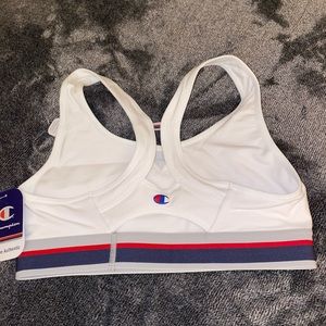 Brand New w Tags Women’s Small Champion sports bra white w red, blue, and gray band Cotton material