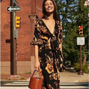 Ultra-flattering floral midi dress featuring a front tie closure and button down