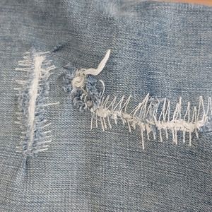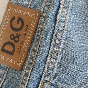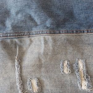 D&G (vintage) distressed denim midi skirt; size 28/42; length from top waist 22"; 16" across. two tone denim. Back slit