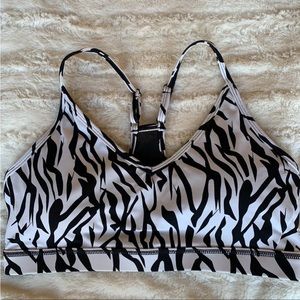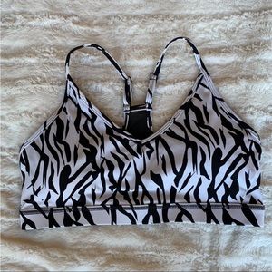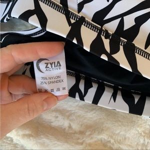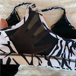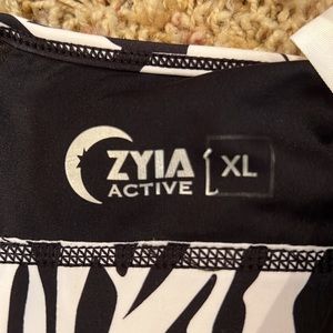 To keep you fresh and cool, this zebra print sport bra includes a mesh panel between the shoulder blades - right where you need it most. Racerback cut with thin, fully adjustable straps. Encased bottom band offers firm support without scratchy elastic or hooks. Four way stretch fabric. Fully lined with removable pads. Can also be worn as a swimsuit top! Worn a couple of times - EUC with no flaws except the square around the size (inside) has peeled, as shown in photos. No visible flaws! Fits 36D to 38D (recommended to size up one from your normal Zyia bra size in this bra).