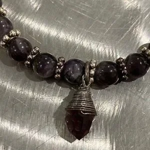 Elastic beaded bracelet with amethyst charm. Handmade. Beads are natural amethyst.