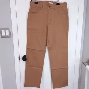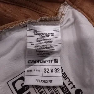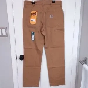 Men's Carhartt Canvas Work Pants. Style Rugged Flex, Relaxed Fit, Five Pocket. Sits at Waist, Relaxed through thigh, Straight leg opening fits over boot. Has Cell Phone Pocket. RN 102517 918. Size 32 Waist by 32 Leg. Color Tan. 98% Cotton, 2% Elasticine. New With Tags.