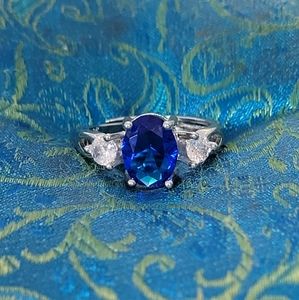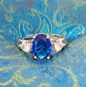 Beautiful ring, the center stone is a large deep blue Zircon & it has to 2 white Zirons. one on each side. This ring is a stunning.