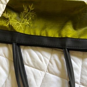 A beautiful hand-embroidered handbag in green color suitable for the size and stylish design