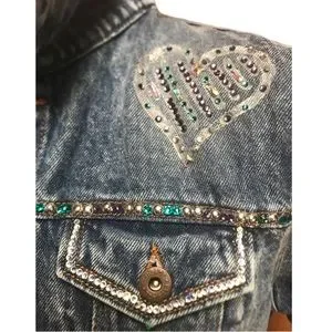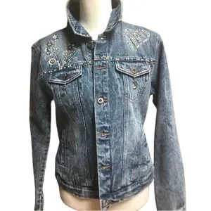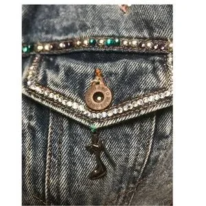 Button front closure with two button pockets and two hand side pockets. Created brand on a brand new blue age jean jacket