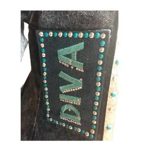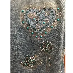 Hand painted high heel with handset crystal floral designs, embroidered hearts and diva with handset crystal and stud designs. In beautiful turquoise, amethyst and silver colors plus era irridesent crystals. Hand sewn silver heel charms on pockets