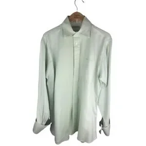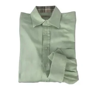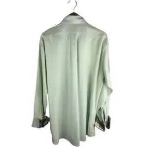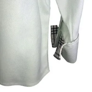 This Burberry dress shirt features classic nova check lining at the neckline & cuffs. The fabric is a soft mint green with a herringbone pattern. French cuffs require cuff links.