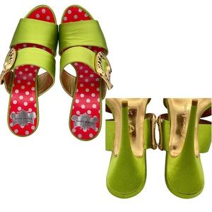⚜️RARE & AUTHENTIC Christian Lacroix green satin stiletto mule sandals with a jewel embellished gold buckle. Transform yourself into a masterpiece with the alluring aesthetic of this ornate objet d'art by Christian Lacroix™. Exquisite satin upper with sexy dark jeweled crystal encrusted gold buckle accent. This pair is a real eye catcher and could m even be worn as unforgettable bridal shoes!