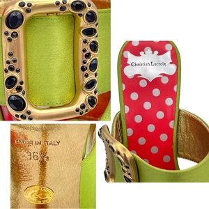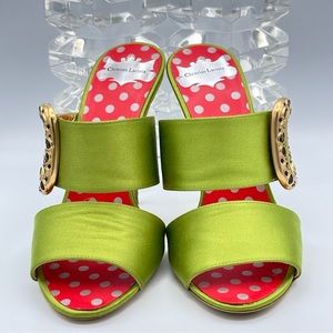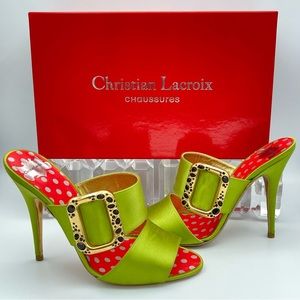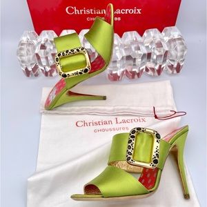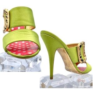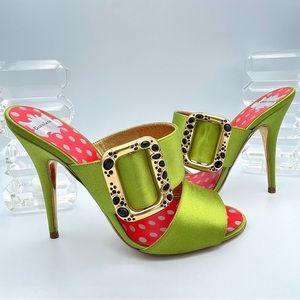 CHRISTIAN LACROIX ⚜️RARE NWT Green Satin Mule Stilettos Jeweled Gold Buckle 36.5