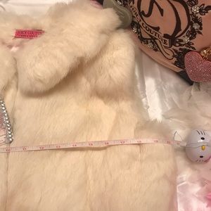Adorable vintage y2k juicy couture genuine 🐇 fur caplete with pretty cotton candy 🍭 pink lining with once upon a time script and custom crystals so it looks amazing reversible too 💖retails for 450 leather is a little dry in parts from age but otherwise it looks amazing Britney Spears wore the same one in pink 😁💖always open to offers and bundles see my closet for tons more vintage juicy couture 🦄