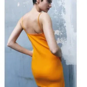 Spaghetti straps. Wraps in the front. Gorgeous orange color.