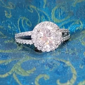 This is a gorgeous ring The center stone is round. The band has dual set of stones. This ring is unique. The band is 3 mm wide. This ring has the bling.